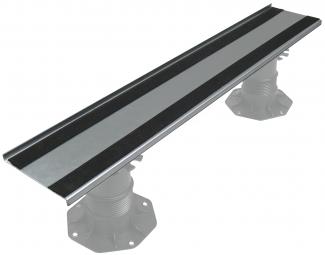 Bei der Plattenverlegung in den Randbereichen, die nicht rechtwinkelig zur Verlegrichtung der Platten verlaufen, wird das Elefeet®-Gehrungs- und Randauflager genutzt. Das 170 mm breite Profil wird parallel zum Randbereich auf den Elefeet® gelegt und lagert selbst kleine Belagszuschnitte auf. Die durchgehende, 15 mm hohe Aufkantung fasst den Plattenbelag ein. Die aufgebrachte Gummierung sorgt für eine rutschsichere Auflage.